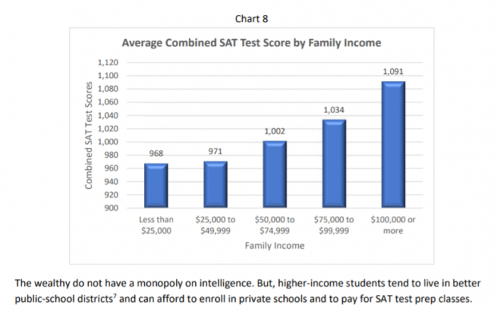 According to the Washington Post, in 2014, “students from families earning more than $200,000 a year average a combined score of 1,714, while students from families earning under $20,000 a year average a combined score of 1,326.”